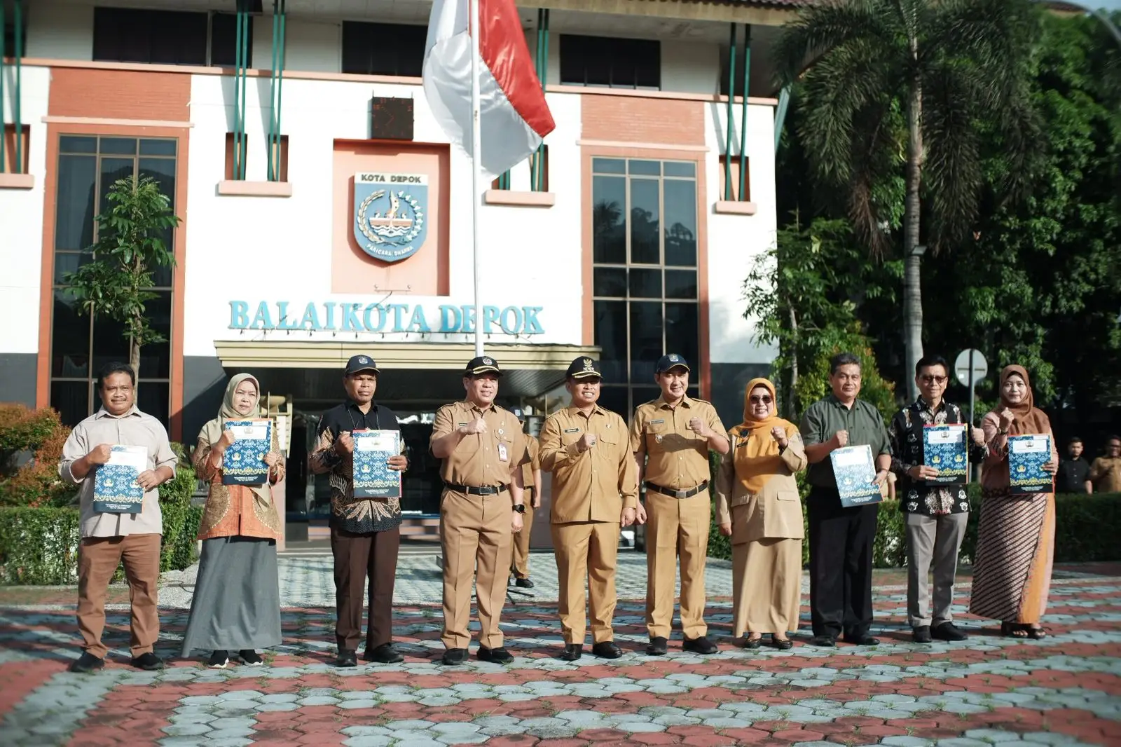 Penyerahan juga disertai bantuan Purna Bhakti dari KORPRI dalam apel pagi di Lapangan Balai Kota Depok, Senin (06/04/26).