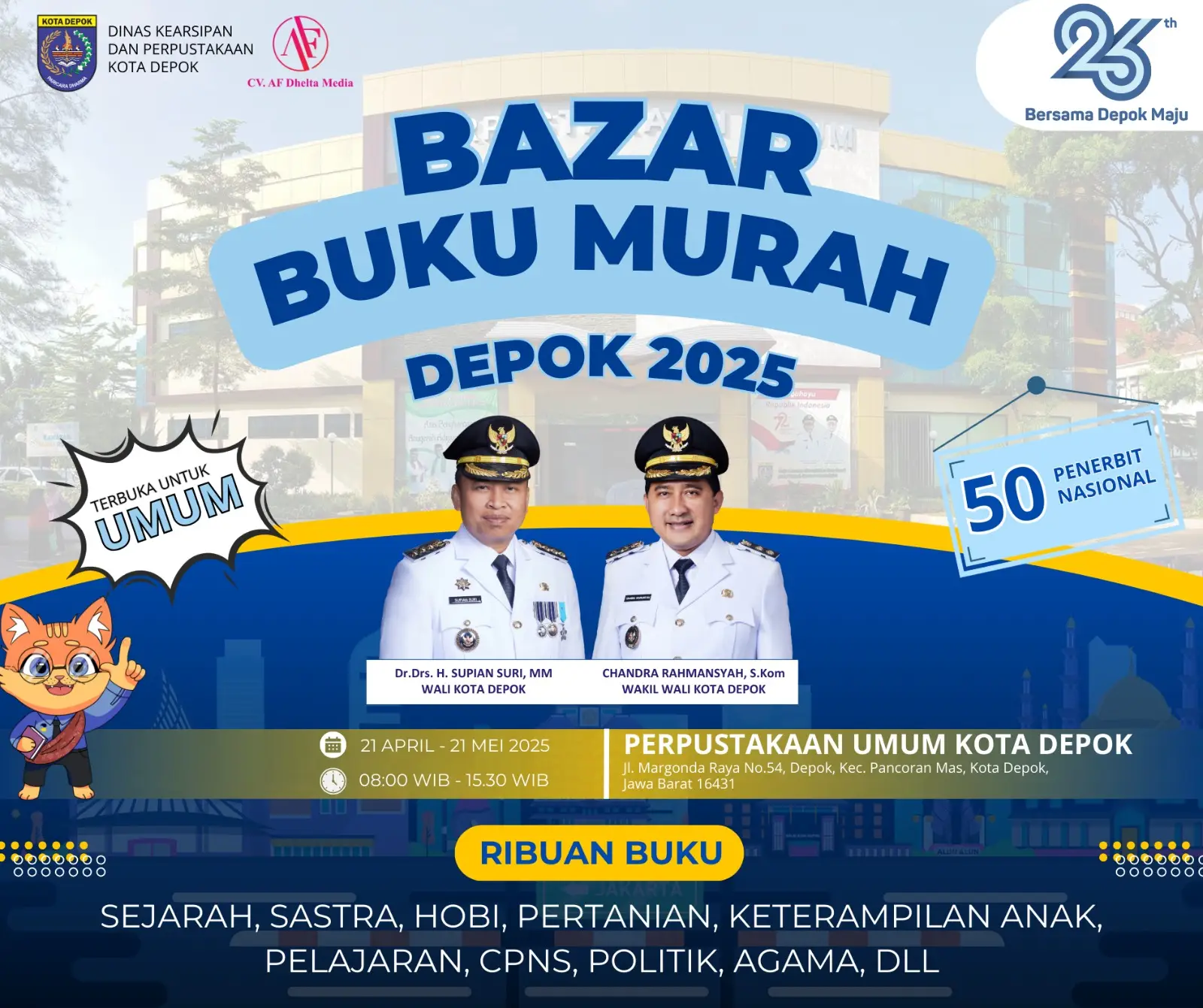 Bazar Buku Murah ini berlangsung mulai tanggal 21 April hingga 21 Mei 2025, bertempat di Perpustakaan Umum Kota Depok.