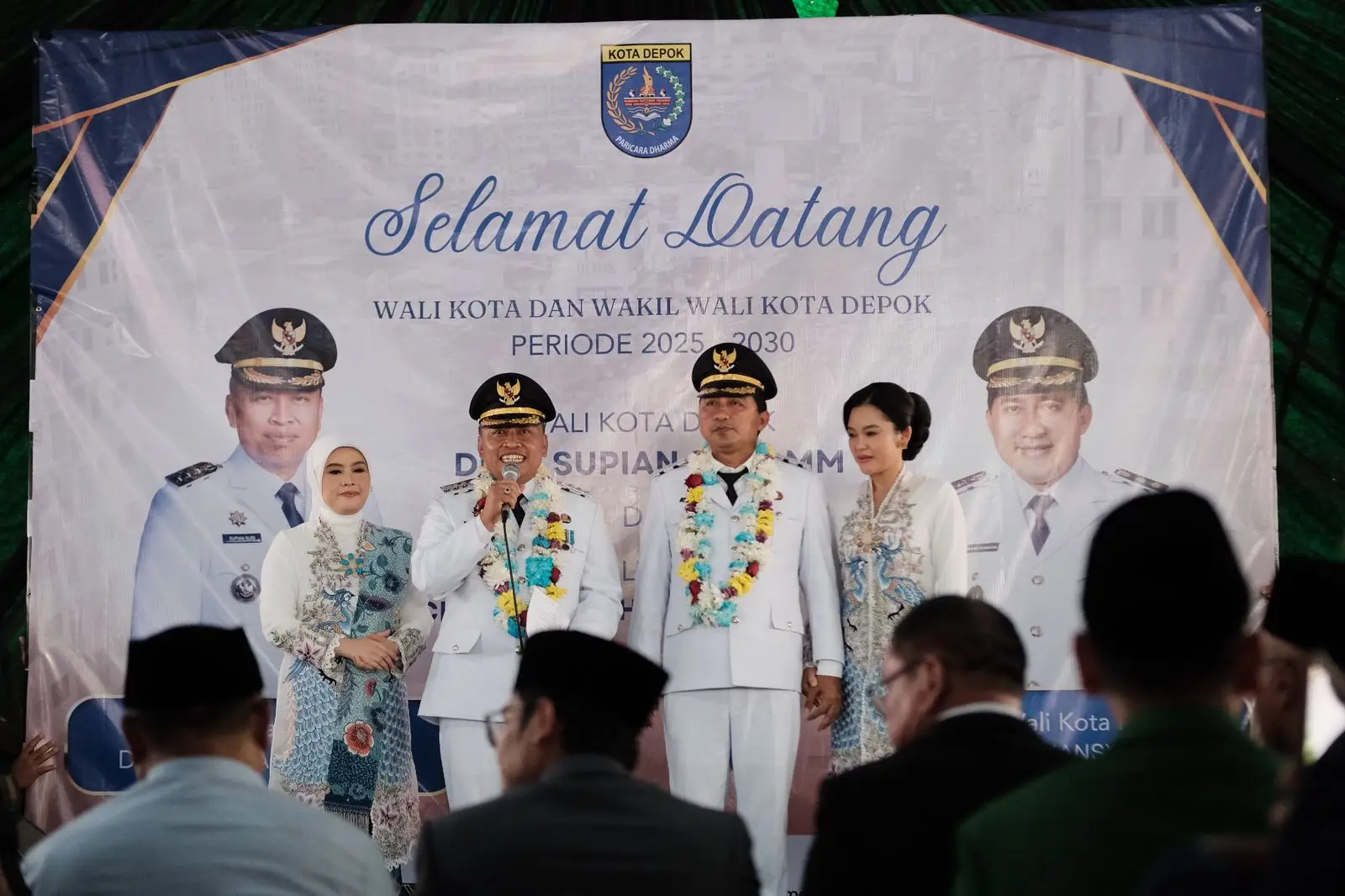 Wali Kota Depok Supian Suri (kedua dari kiri) saat memberikan pidato perdana di Lapangan Balai Kota Depok, Kamis (20/02/25) kemarin. (Foto: Diskominfo Depok).
