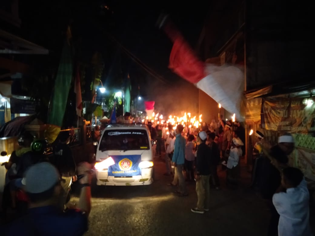 Foto : Karang Taruna (Katar) RW13 dan masyarakat Kelurahan Depok, Kecamatan Pancoran Mas, Kota Depok, Jawa Barat menyambut 1 Muharam 1441 Hijriyah dengan berkeliling Kampung Lio dengan membawa obor sambil membaca salawat Nabi Muhammad SAW. (M.Irwan Supriyadi/WartaDepok.com)
