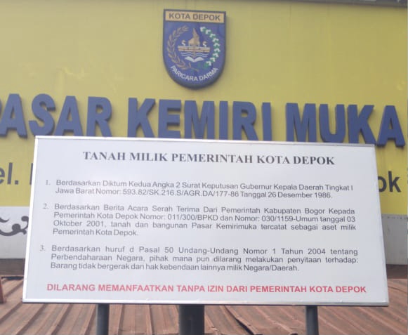 Untuk pengamanan fisik barang milik Negara/Daerah salah satu caranya dengan pemasangan plang papan nama aset. “Tanah dan bangunan Pasar Kemirimuka milik Pemkot Depok dan sesuai aturan yg berlaku wajib diamankan dengan cara salah satunya pemasangan plang di lokasi Pasar Kemirimuka bang,” kata Nina Suzana.