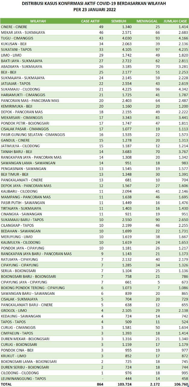 Pancoran Mas dan Kemiri Muka terdapat 20 kasus. Kemudian, Kelurahan Sukamaju dan Harjamukti, mencatatkan 21 kasus dan Jatijajar mencatatkan 22 kasus konfirmasi aktif Covid-19.