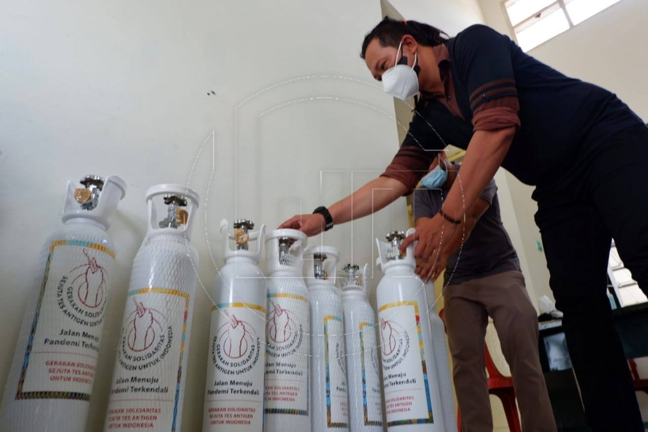 Relawan menyiapkan tabung oksigen untuk dipinjamkan kepada warga di kawasan Grand Depok City, Kota Depok, Jawa Barat, Jumat (9/7). Program "Oksigen Untuk Warga" yang digagas oleh Gerakan Solidaritas Sejuta Tes Antigen Untuk Indonesia tersebut meminjamkan tabung oksigen secara gratis kepada pasien COVID-19 dengan kriteria tertentu yang sedang isolasi mandiri.(Ahmad Fachry/Warta Media Group)