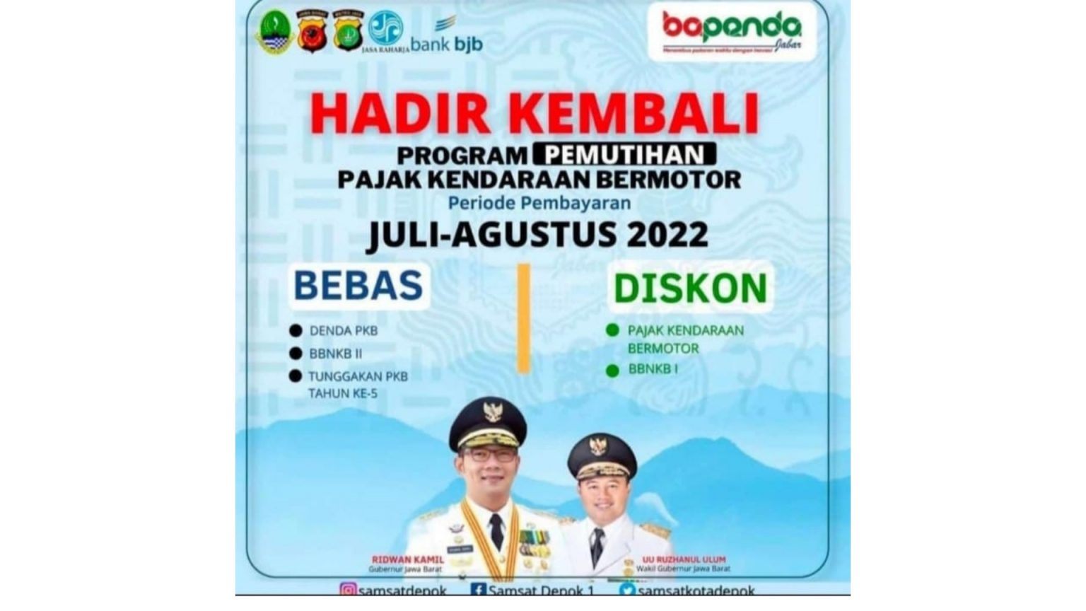 WartaDepok.com – Kepala Bidang Pajak Daerah I BKD Kota Depok, Yuli Puspita Anggraini mengimbau agar masyarakat di Kota Depok untuk memanfaatkan Program Pemutihan Pajak Kendaraan Bermotor (PKB) yang digagas Pemerintah Provinsi Jawa Barat (Jabar). Program itu memberikan diskon pajak kendaraan hingga penghapusan denda.
