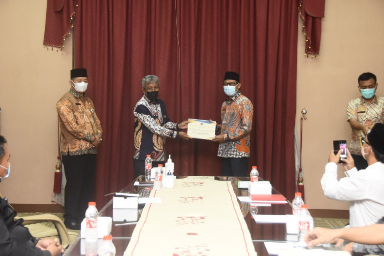 Wakil Wali Kota Depok, Imam Buri Hartono didampingi Asisisten Asisten Pemerintahan Dan Kesejahteraan Rakyat pada Sekretariat Daerah, Sri Utomo secara simbolis bantuan hibah bidang keagamaan kepada penerima manfaat di Balai Kota Depok, Jumat (15/07/22). (Foto : Istimewa)