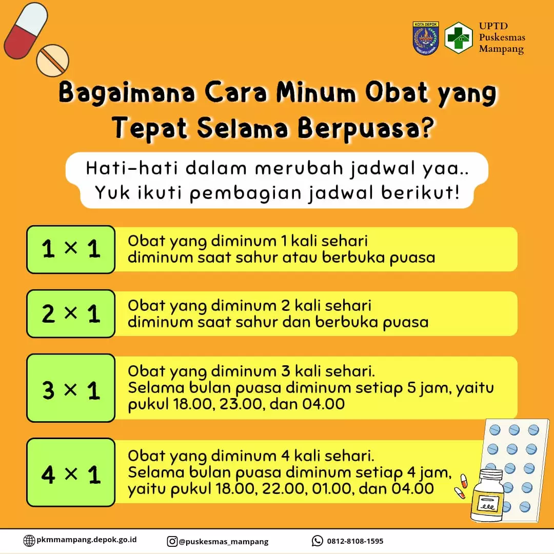 “Hati-hati dalam mengubah jadwal minum obat, karena harus tepat. Misalnya saja, untuk obat yang diminum 1×1, bisa diminum saat sahur atau setelah berbuka puasa,” ujar Kepala UPTD Puskesmas Mampang Winarni Naweng Triwulandari, Jumat (31/03/23).