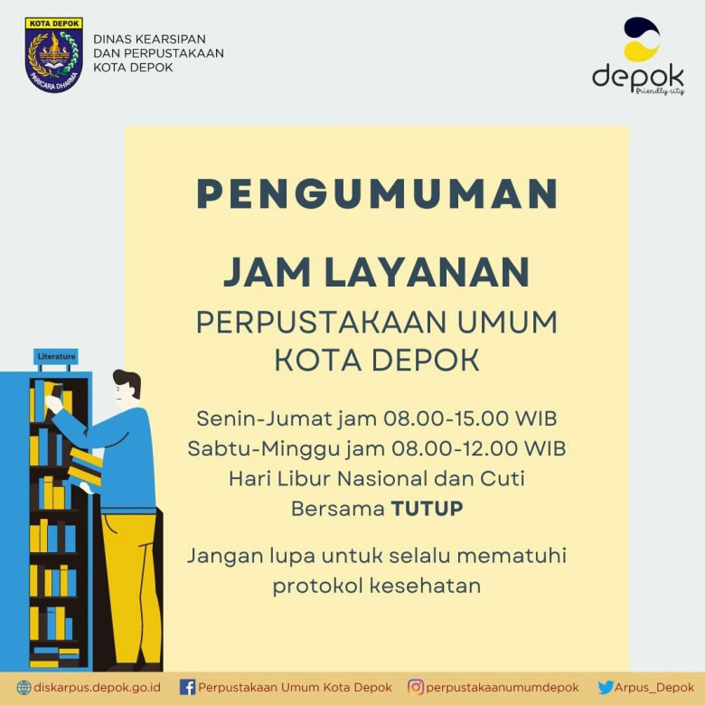 WartaDepok.com – Dinas Kearsipan dan Perpustakaan (Diskarpus) Kota Depok menyampaikan layanan Pepustakaan Umum Daerah Kota Depok sudah kembali dibuka secara normal. Bagi masyarakat yang ingin membaca buku dan koleksi bacaan lainnya dapat berkunjung pada jadwal yang sudah ditentukan.