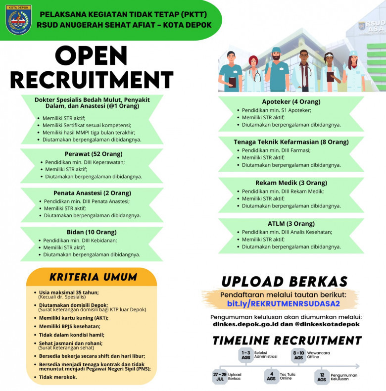 “Lalu, dibutuhkan Apoteker sebanyak empat orang, Tenaga Teknik Kefarmasian delapan orang, Rekam Medik tiga orang dan Ahli Teknologi Laboratorium Medis (ATLM) tiga orang,” tuturnya dilansir melalui laman resmi Pemkot Depok.