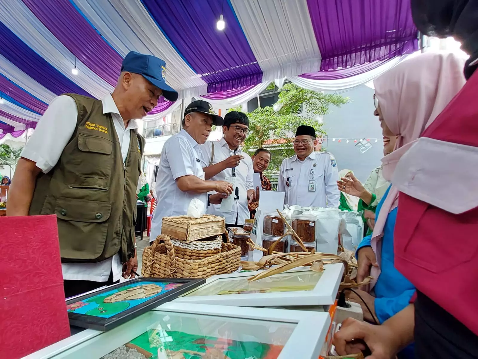 Camat Tapos, Abdul Mutolib didampingi Lurah Jatijajar melihat produk Bank Sampah Rehap RW 07 di Kelurahan Jatijajar, Rabu (09/08/23). (Foto : Diskominfo)