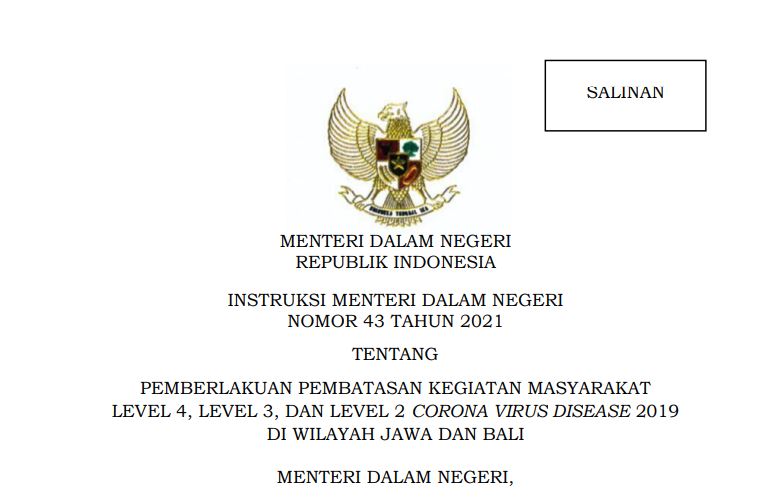 WartaDepok.com – Menteri Dalam Negeri (Mendagri) Tito Karnavian menerbitkan Instruksi Menteri Dalam Negeri (Inmendagri) Nomor 43 Tahun 2021 tentang Pemberlakuan Pembatasan Kegiatan Masyarakat (PPKM) Level 4, Level 3, dan Level 2 Corona Virus Disease 2019 di Wilayah Jawa dan Bali.