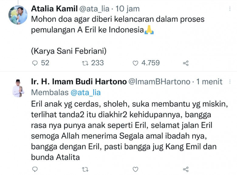 “Eril anak yg cerdas, sholeh, suka membantu yg miskin, terlihat tanda2 itu diakhir2 kehidupannya, bangga rasa nya punya anak seperti Eril, selamat jalan Eril semoga Allah menerima Segala amal ibadah nya, bangga dengan Eril, pasti bangga juga Kang Emil dan bunda Atalita,” cuit akun twitter @ImamBHartono, Jumat (10/06/22).