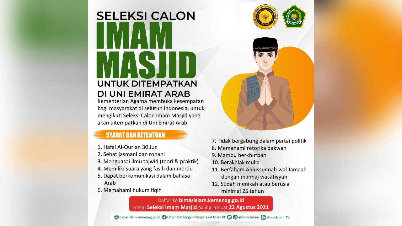 WartaDepok.com – Kementerian Agama kembali membuka seleksi imam masjid asal Indonesia untuk ditempatkan di Uni Emirat Arab. Seleksi akan dilangsungkan secara virtual pada 25-27 Agustus 2021.