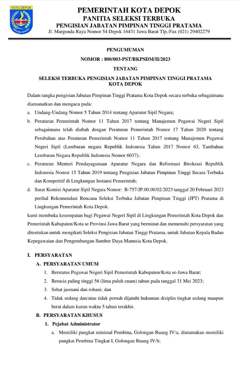 WartaDepok.com – Pemerintah Kota (Pemkot) Depok membuka lelang jabatan untuk posisi Kepala Dinas Badan Kepegawaian dan Pengembangan Sumber Daya Manusia (BKPSDM). Hal ini berdasarkan Surat Pengumuman Nomor: 800/003-PST/BKPSDM/II/2023 tentang Seleksi Terbuka Pengisian Jabatan Pimpinan Tinggi Pratama Kota Depok.