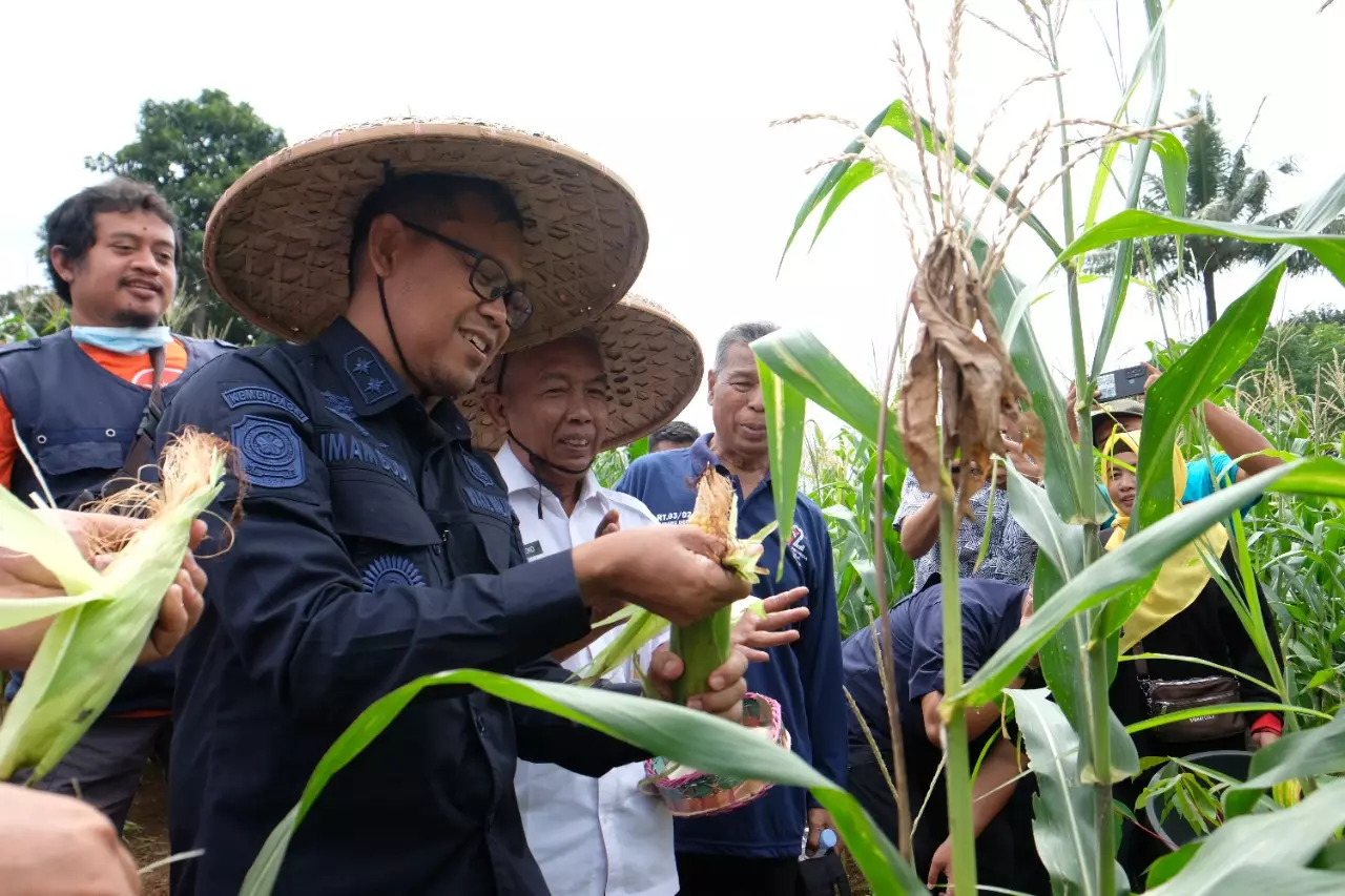 Di sela-sela panen jagung, Bang Imam, sapaannya, mengapresiasi KWT Delima Merah yang telah melakukan penanaman jagung dan jenis tanaman lainnya di atas lahan 1.400 meter persegi tersebut.