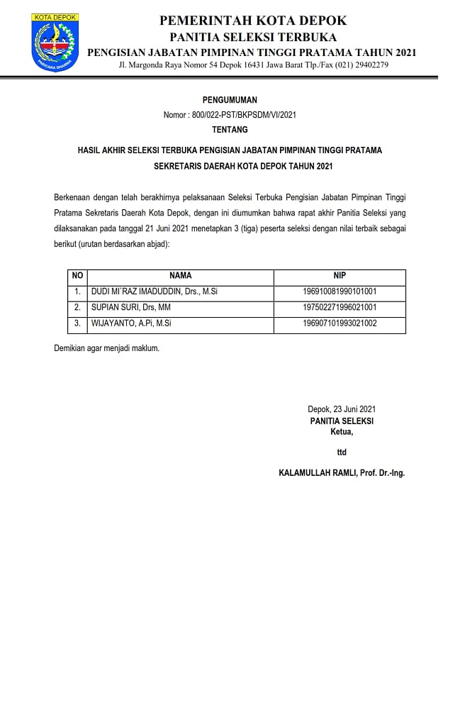 Berkenan dengan telah berakhirnya Seleksi Terbuka Pengisian Jabatan Tinggi Pratama Sekretaris Daerah Kota Depok, dengan ini diumumkan bahwa rapat akhir Panitia Seleksi yang dilaksanakan pada tanggal 21 Juni 2021 menetaptkan tiga peserta seleksi dengan nilai terbaik,” ujar Kalamullah Ramli, melalui keterangan resminya, Rabu (23/6/2021).