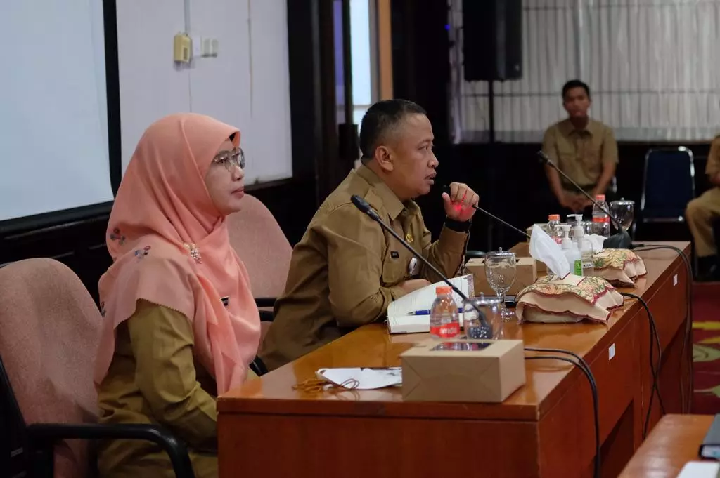Sekda Kota Depok, Supian Suri, didampingi Kepala Dinas Kesehatan, Mary Liziawati, saat menghadiri Rakor Evaluasi Kota ODF 100 persen di Ruang Edelweiss, Lantai 5, Balai Kota Depok, Senin (20/02/23). (Foto: Diskominfo).