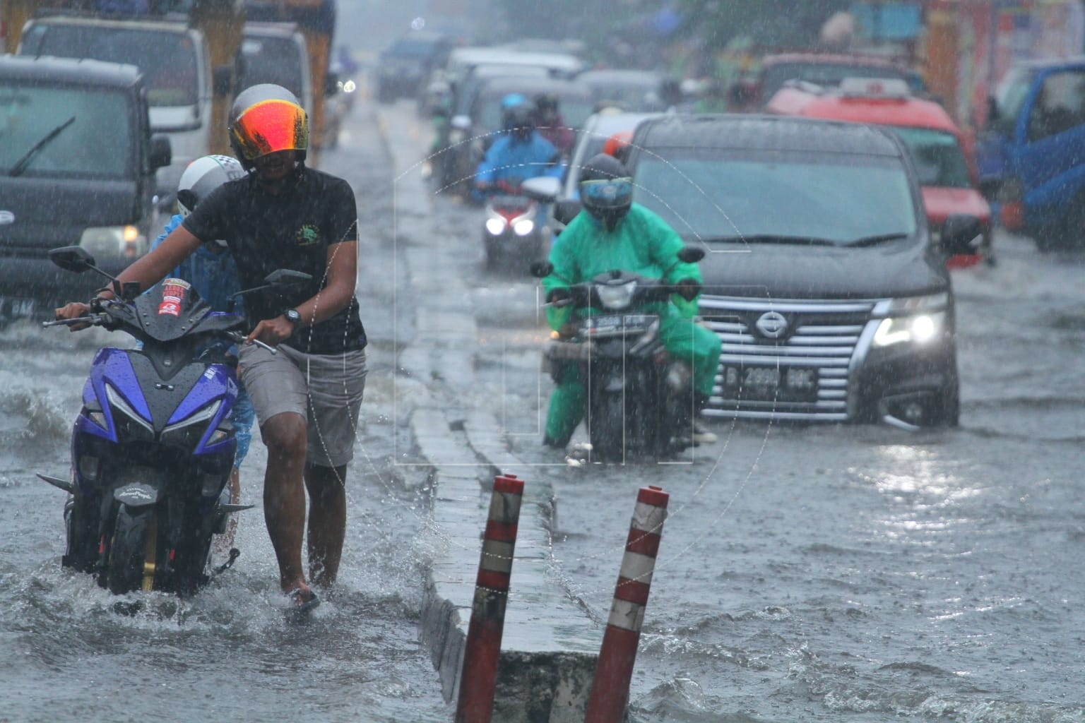 Sejumlah kendaraan menerobos genangan air di Jalan Margonda Raya, Kota Depok, Jawa Barat, Kamis (5/8). Genangan air setinggi 30 cm sampai 60 cm merendam kawasan tersebut yang diakibatkan tingginya curah hujan serta drainase yang buruk.(Ahmad Fachry/Warta Media Group)