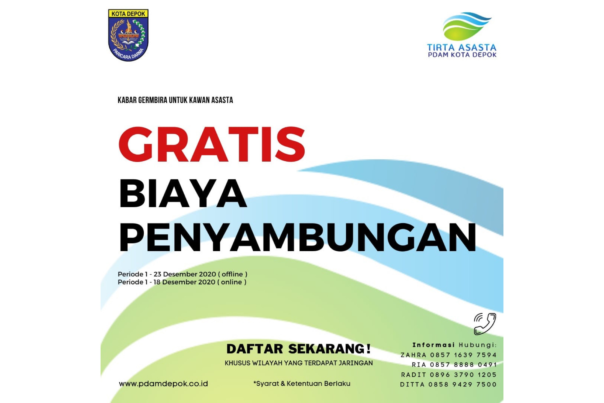 WartaDepok.com – Dalam rangka percepatan cakupan pelanggan serta turut serta dalam meringankan perekonomian masyarakat di masa pandemi Covid19, PDAM Tirta Asasta Kota Depok mengadakan promo akhir tahun “GRATIS BIAYA PENYAMBUNGAN” bagi masyarakat Depok pada lokasi lokasi yg sdh terdapat jaringan PDAM Tirta Asasta Kota Depok.