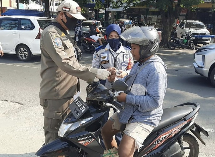 Serta di depan kantor Kecamatan Sukmajaya terdapat 12 pelanggar yang membayar denda dan 1 orang dengan sanksi sosial.