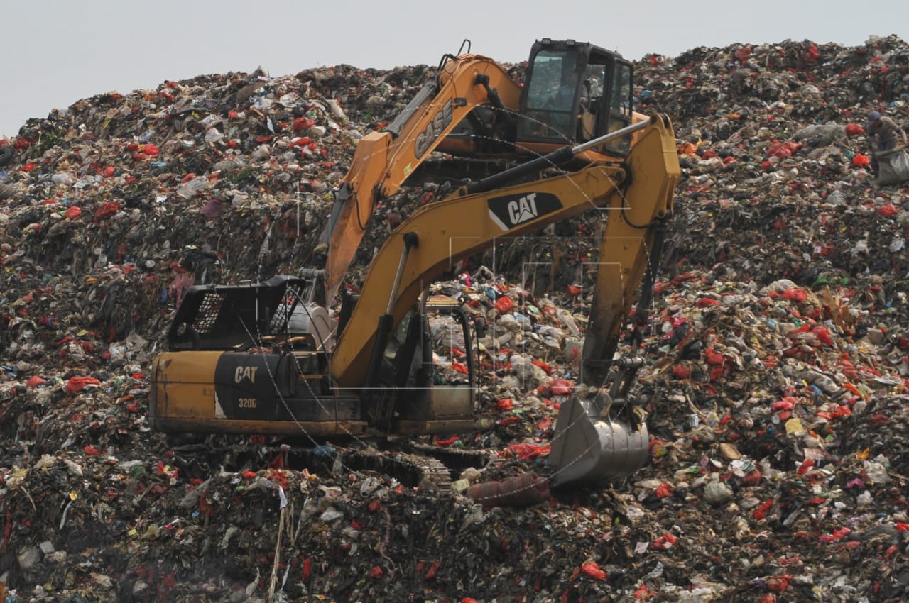 Alat berat mengeruk sampah di TPA Cipayung, Kota Depok, Jawa Barat, Selasa (18/5). Dinas Lingkungan Hidup dan Kebersihan (DLHK) Kota Depok mengatakan, volume sampah meningkat sampai 200 ton per harinya selama lebaran Hari Raya Idul Fitri 1442 H. (Ahmad Fachry/Warta Media Group)