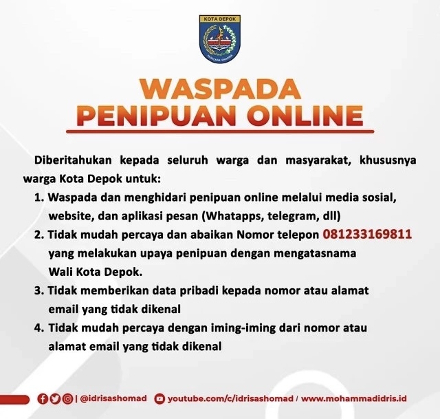 “Diberitahukan kepada seluruh warga dan masyarakat, khususnya warga Kota Depok untuk waspada dan menghidari penipuan online melalui media sosial, website, dan aplikasi pesan (Whatapps, telegram, dll),” tulisnya.