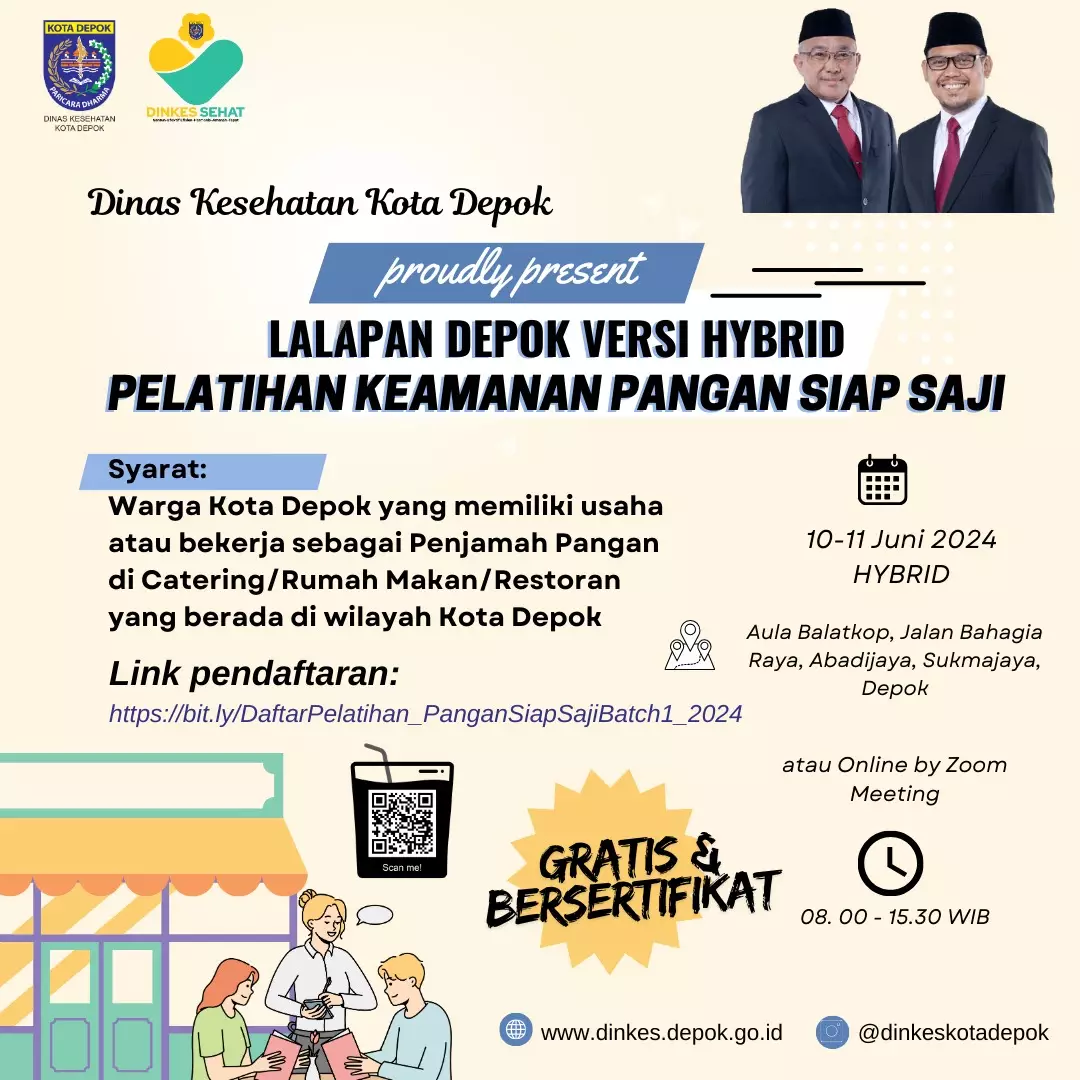 WartaDepok.com – Dinas Kesehatan (Dinkes) Kota Depok membuka program Lalapan Depok (Kelas Pelatihan Pangan Aman Online). Kegiatan tersebut akan berlangsung secara hybrid di Aula Balai Pelatihan Koperasi (Balatkop) Kota Depok atau zoom meeting pada 10-11 Juni 2024.