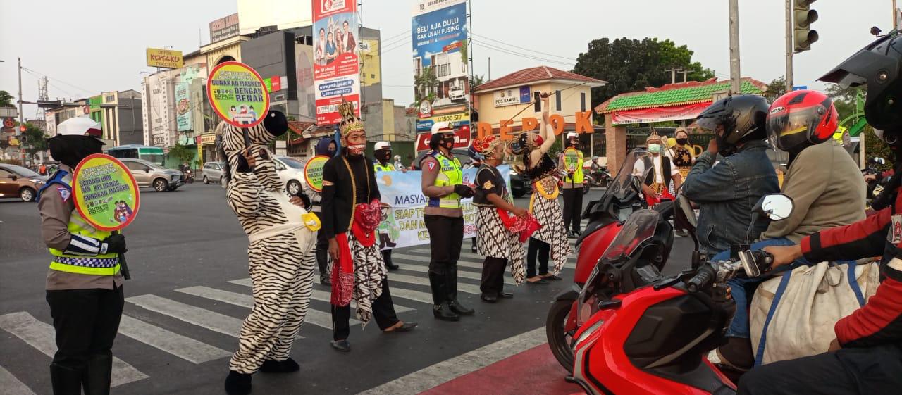 Para tokoh wayang itu juga memberikan sosialisasi serta edukasi bersama Satlantas Polres Metro Depok pada warga mengenai pentingnya menggunakan masker.