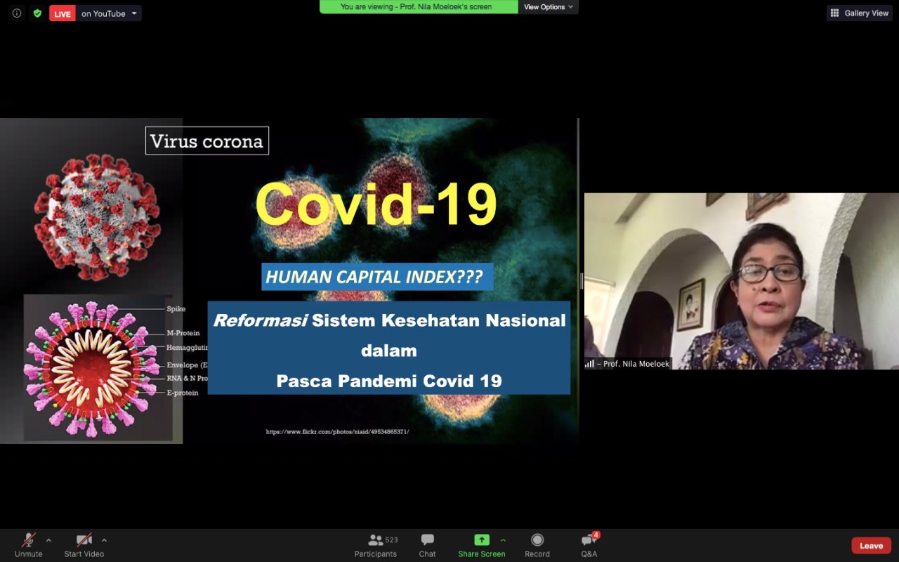 Prof. Nila Moeloek melempar pertanyaan, apakah human capital index dapat tercapai dengan terganggunya COVID-19? Ia melanjutkan, “Tentu kita harus melihat ke sistem kesehatan nasional yang harus direformasi. Melalui Penguatan Pelayanan Kesehatan, Jaminan Kesehatan Nasional, dan Paradigma Sehat.