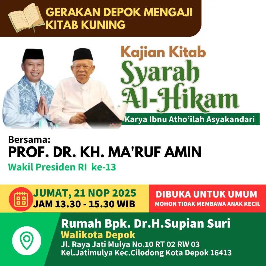 WartaDepok.com – Pengurus Cabang Nahdlatul Ulama (PCNU) Kota Depok mengajak masyarakat menghadiri kegiatan Gerakan Depok Mengaji Kitab Kuning, yang akan menghadirkan kajian Syarah Al-Hikam karya Ibnu Atha’illah Asyakandari bersama Wakil Presiden RI ke-13, Ma’ruf Amin.
