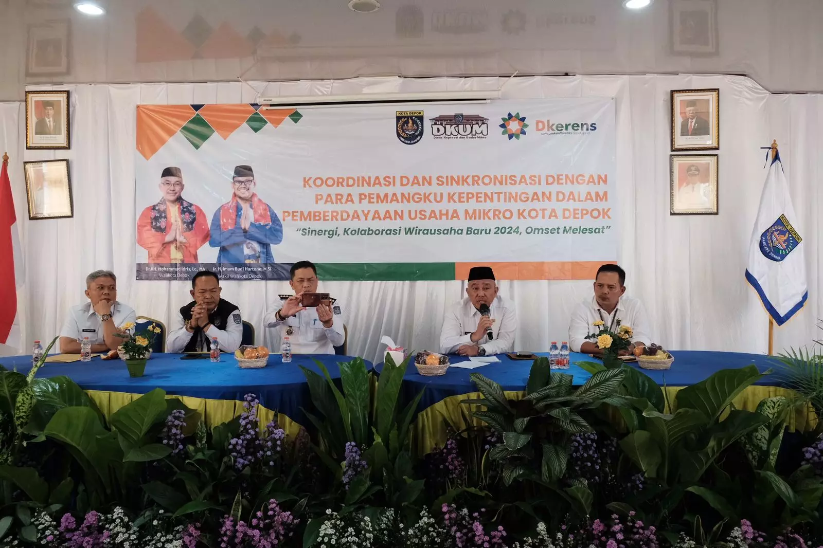 Wali Kota Depok, Mohammad Idris didampingi Kepala DKUM Kota Depok Dede Hidayat, Camat Sawangan dan Bojongsari saat acara Koordinasi dan Sinkronasi Pelaku Usaha Mikro Tahun 2024 di Aula Kantor Kecamatan Sawangan, Rabu (07/02/2024). (Foto: Diskominfo.)