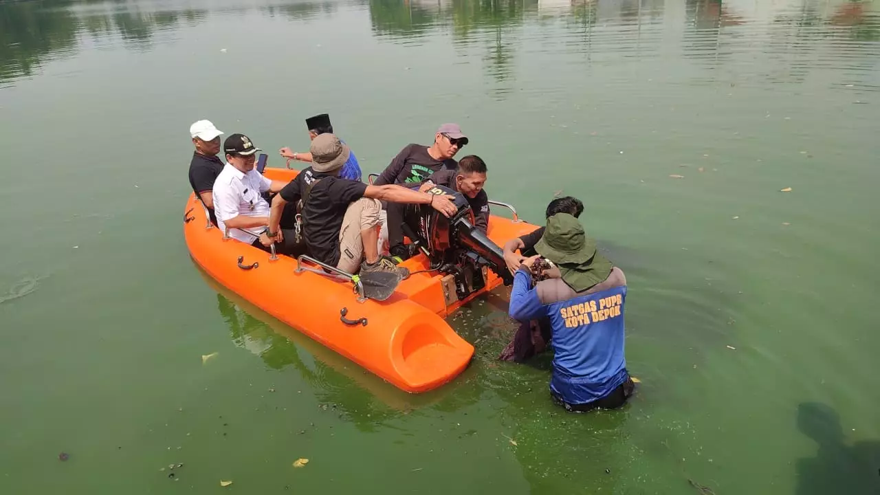 Camat Cipayung, Hasan Nurdin dan Lurah Bojong Pondok Terong, Adi Supriadi meninjau dan ikut turun membersihkan Situ Citayam.