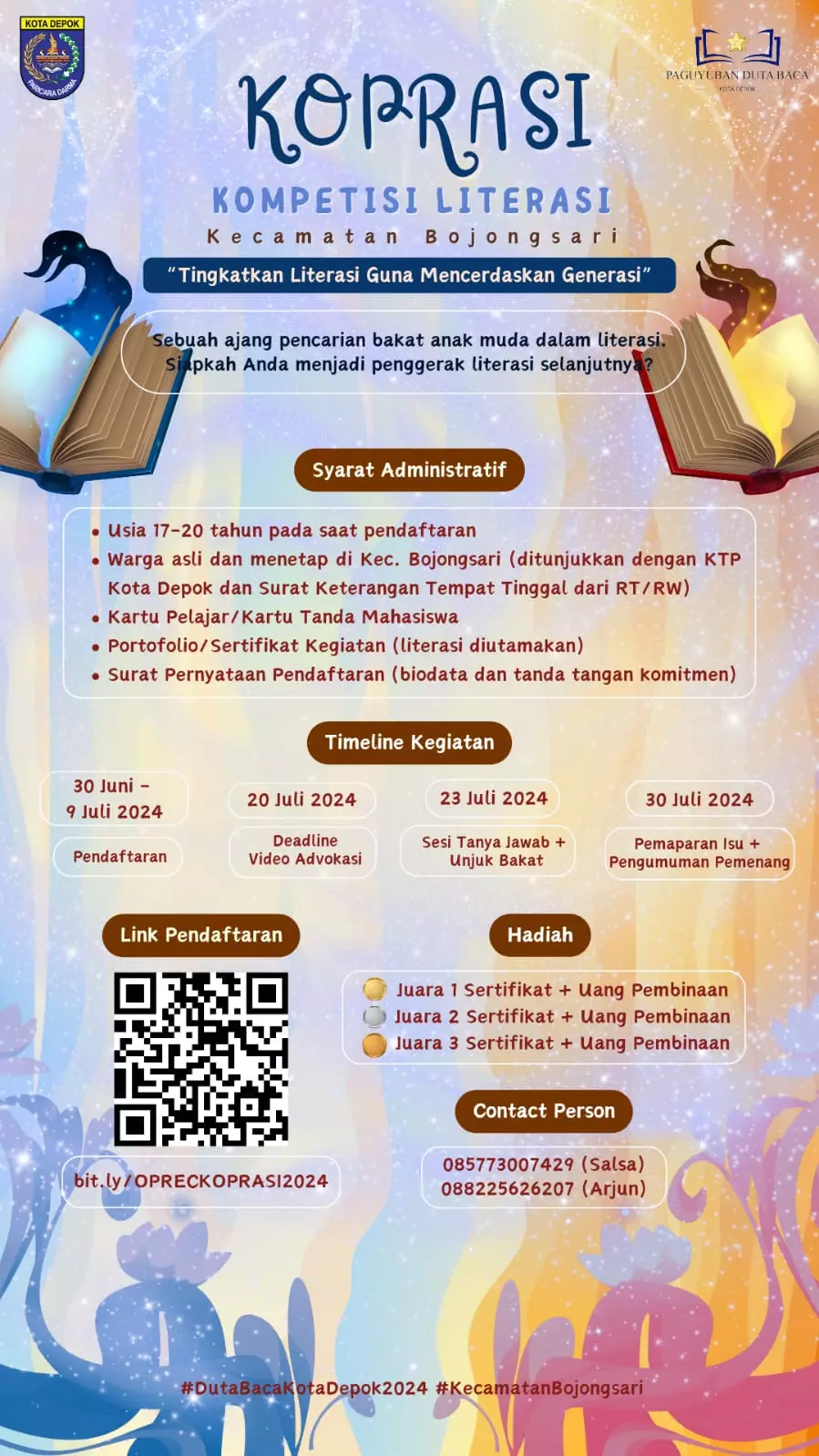 “Kompetisi literasi ini merupakan ajang pencarian bakat untuk anak muda dalam literasi, yang nantinya akan kita tunjuk menjadi penggerak literasi di kecamatan. Selain itu kompetisi ini juga salah satu langkah untuk mencari bibit unggul dari kecamatan untuk regenerasi duta baca selanjutnya, sehingga nantinya ajang pemilihan duta baca tingkat kota dapat lebih tersaring dari segi sumber daya manusia,” ujar Ketua Pelaksana Koprasi, Danish dilansir melalui laman resmi Pemkot Depok