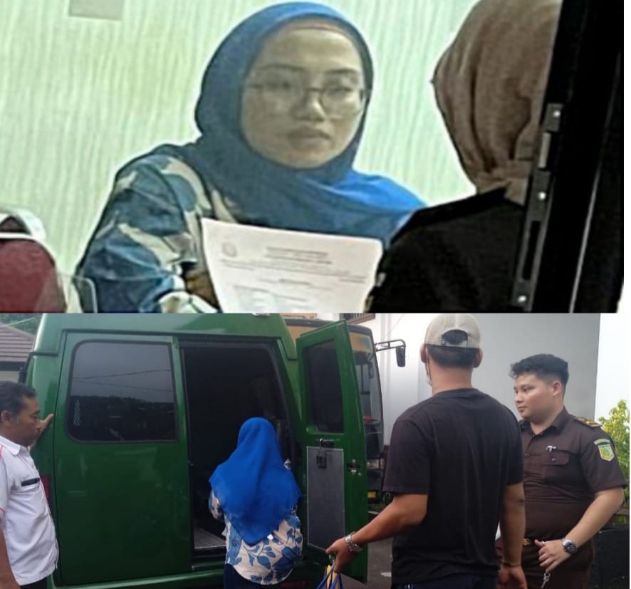 Begini penampakan Dhatiyah perempuan kelahiran Purworejo yang tertunduk malu dengan mengenakan kerudung biru dan tangan diborgol usai keluar dari ruang tahap 2 Kejari Depok menuju mobil tahanan.